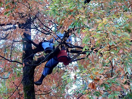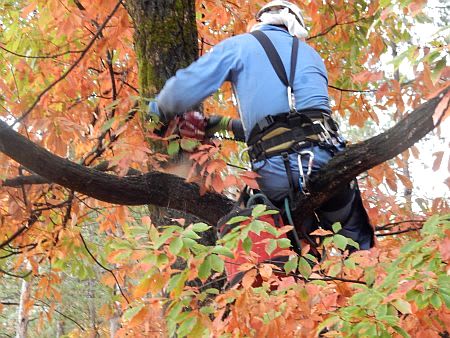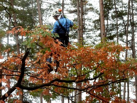 特にミズナラは2012年の松の伐採後、ますます繁茂し困っていたので、クレーン出動の剪定となった。