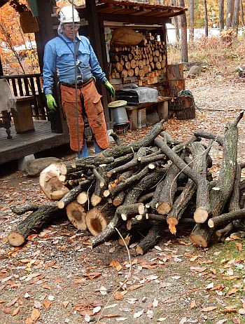 太い幹や枝を、ひとまとめごとに、吊るしあげ空き地にいったん保管