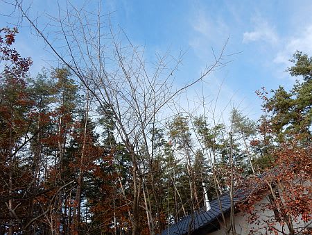 狭い庭にごちゃごちゃ無造作に立つ樹木。