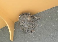 新装開店のひつじ屋さんを冷やかしに行くと軒下の燕が、まさに燕返しでせっせと餌を運んでいました