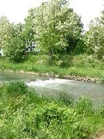 写真左:わんだーえっぐ基地前の、少し増水の万水川。アカシア並木が続く