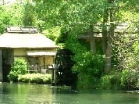 写真右:ワサビ田の水車小屋付近をおだやかに進む