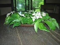 写真:浅い鉢に活けられたテーブル上のヤマボウシ。派手すぎず地味すぎない絶妙のインテリア