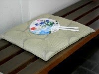 写真右:館内ベンチに置かれた座布団とうちわ(鑑賞に疲れたらごゆっくり?)