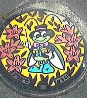 写真右:「まつかわ おすい」と銘のあるマンホールのふた