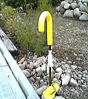 写真右:傘の花。まさか! 敷地と道路の境界線にある入口表示(夜間対策かな?)