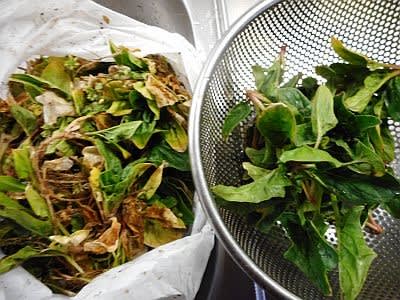 黄色の葉と根を除くと結局20㎝のザルがいっぱいになり、結構な量だ。