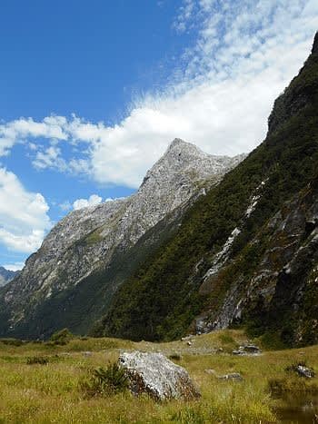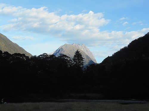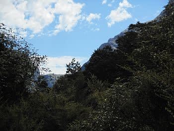 このロッジから右方向の吊り橋からスタートし、手前の森と中央の山の間を歩き、