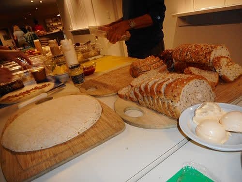 大きなテーブルに食パンとバター、ハム、ジャム、チーズ、レタス、ビーツなど