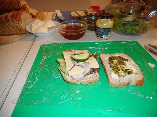好きなだけ挟んでサンドイッチを作り、大きなラップでくるんで紙袋に収めてザックへ。