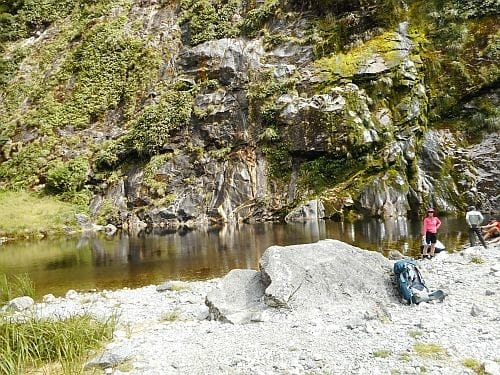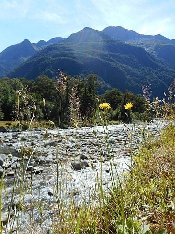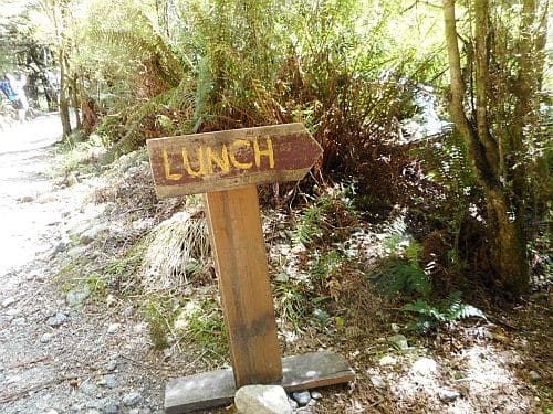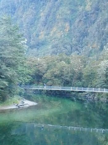 ロッジから出てまもなく、エメラルドグリーンのクリントン川にかかる吊り橋を渡る