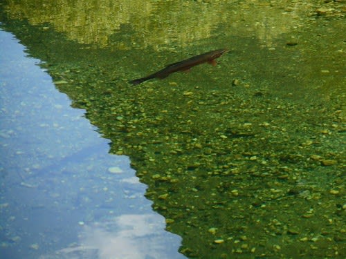 その後の休憩小屋で大歓声があがったのは、そばの川か池でニジマスを釣り上げたと。