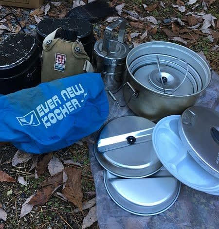 ステンレスの丸い3段弁当箱は、初めて行ったときのインド土産です。