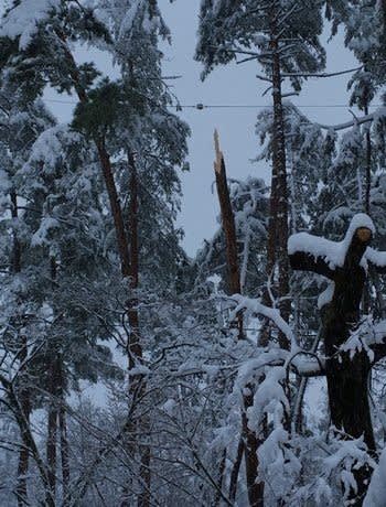 発見後すぐに、役には立たないかもしれないが野菜用の支柱4本で保護した。松は雪が解け始めるとのんびり元に戻りました。
