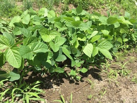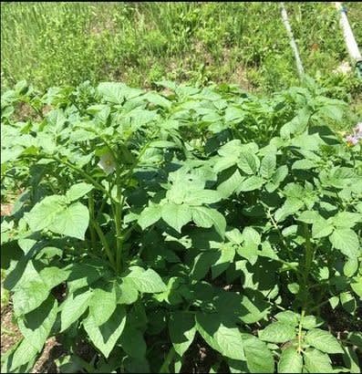 このジャガイモの種いもは無農薬栽培の農家さんから分けて頂いたもの。これもずっしり逞しい成長ぶりです。収穫が楽しみ。