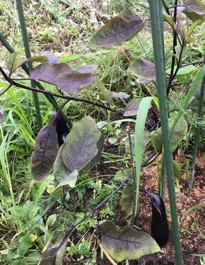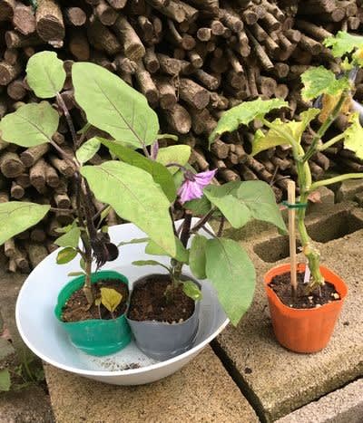 野菜は水だけでは育ちません!太陽が欲しい。ナスとキュウリは非常事態中。何とか実になっているが葉っぱが・・・・