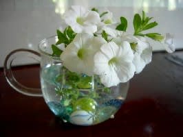 写真右:ビー玉を入れたガラスカップに白い花を浮かべて涼しげに