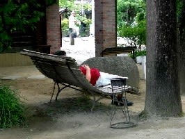 写真右:寝転んで座ると青い空と緑の木々で疲れが吹き飛びます