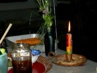 来宅の次男夫婦と庭で夕食。ろうそくはアフリカ・ザンビア旅行で、ろうそく立てはニュージーランド片田舎の骨董屋で。ずっと以前の土産が適所を得てこんなに活かせるとは・・・・。花瓶は化粧水の空き瓶、花は近くの林から失敬。ふぅ安上がり