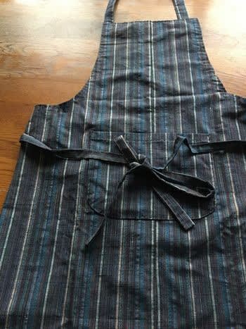 冬場は割烹着型を使うことがおおいですが、基本エプロンはこの形に限ります。首掛けして後ろで結ぶだけ。