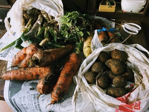 ジャガイモは以前無農薬栽培の農家さんから購入した食用ものを、種イモとして植えてたところ大豊作だった役者さん。