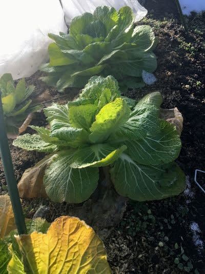 ハクサイは5玉中3個健在。いずれ巻き上げてゆくつもりらしい。