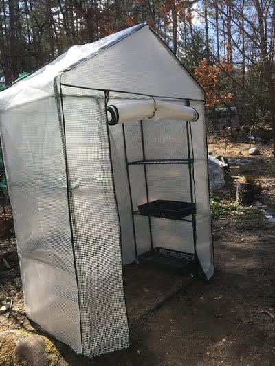 ポット利用には温度管理が大切、思いきって小型の温室を購入した。結構頑丈です。