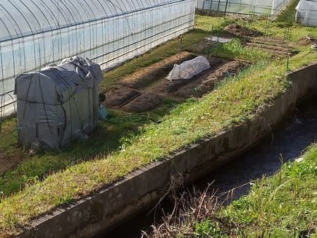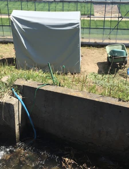手前の水路は、借りている農家さんのお計らいで汲み上げて散水に使わせていただいてます。
