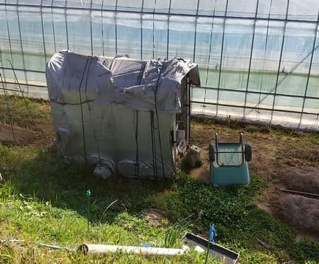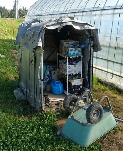 その後資材が増えて自転車2台収納のサイクルハウスを設置。雨風に耐え破れたらビニールシートをかぶせながら8年くらいたちました。