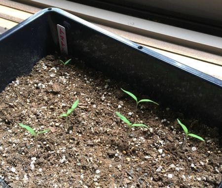 アウトかもしれないと再度同じトマト種(10粒)を購入し、今度は2段階方法でトレーに植えた。4月15日から9日間で発芽。前回より気温が高いこと、屋内で管理したことがよかったのだろう。