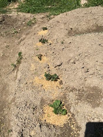 有機栽培の知人からいただいた昨年収穫の小粒のジャガイモを、2個1組で緊急畝に植えてみたら、なんと2週間で芽を出しました。やはり強いです。