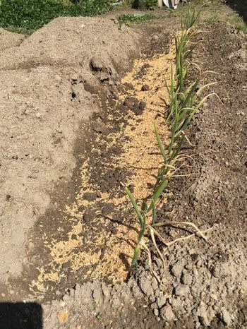 4月16日に植えた深ネギ(松本一本ネギ)が20本ほど残ったので、サツマイモ用の畝の片側に植えてみたら、何とか立っています。右側の30センチほどの空き地に”サラダごぼう”の種8個も植えてみました。
