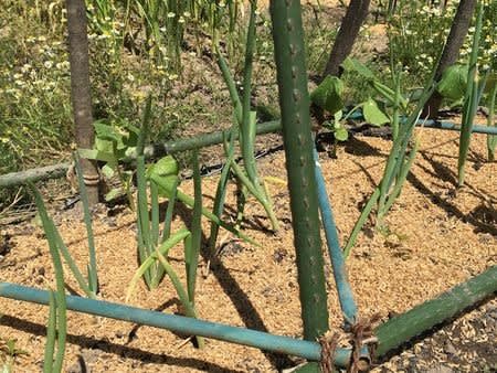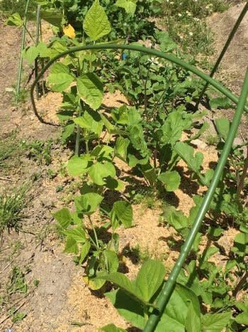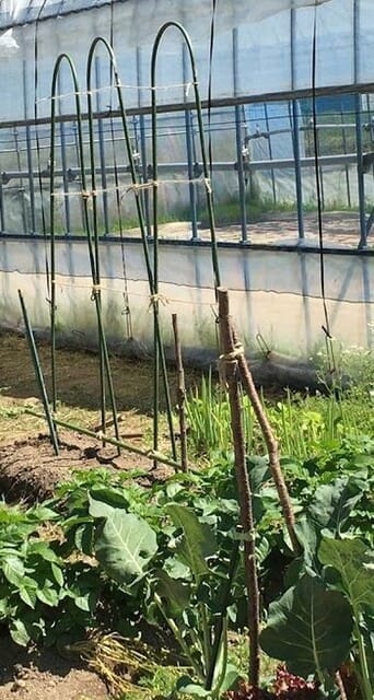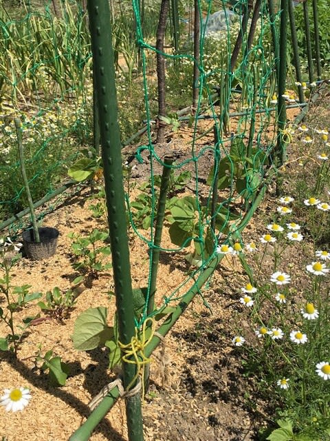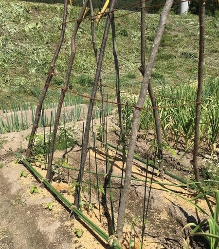 支柱は、庭や林で拾い集めた桜などの木の枝と従来のイボ支柱とミックスで、組み立てたもの。隣のつるありインゲン用の支柱と合作。