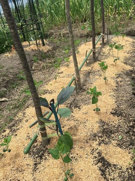 エダマメ(越後ハニー)の畝に混植するナス。ナスの支柱はあるサイトで見つけたスタイルで、3本仕立てになるのだが伸びた枝先をタコ糸か細目の麻ヒモで結ぶ方法を試みる。