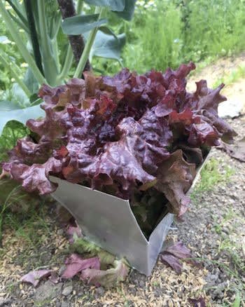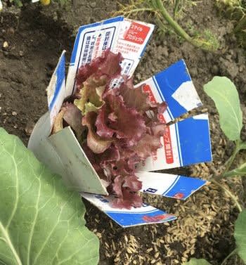 レタスの広がり解消に試したのがこれ。時々お邪魔するブログの、ペットボトルをカットしてレタスを植えつけておられる(と思う)のを参考に真似っこを試みる。蒸れてこないかと心配しているが今のところセーフ!