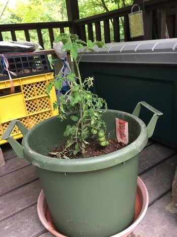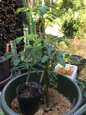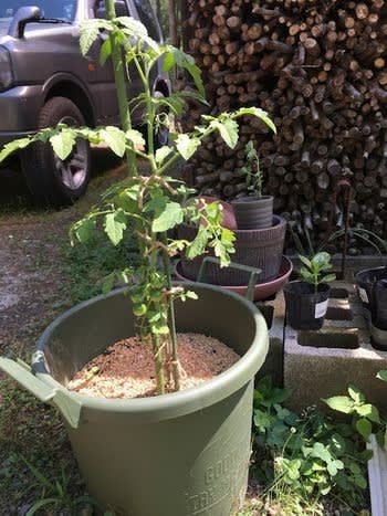 7ガロンタイプで直径35㎝、高さ30cm。畑の種から栽培トマト「サンティオ」の1本を、プラタイプ鉢と同様に畑で待ち伏せさせ一気に移植したもの。
