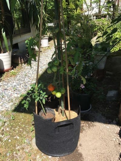 菜園で育ったトマトを不織布鉢に移植。育つか心配したがOK!