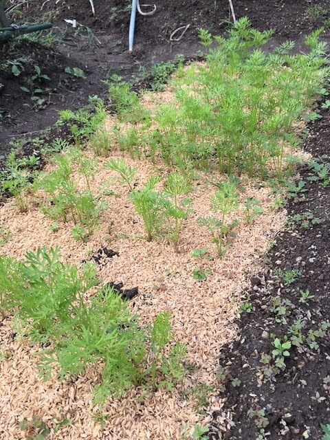 左上手前は8月初旬に種を播いたニンジン筑摩五寸。昨年と同じ品種。新聞紙をかぶせて水やりに注意し乾燥を防せげた結果かな?そろそろ間引きしなければ。