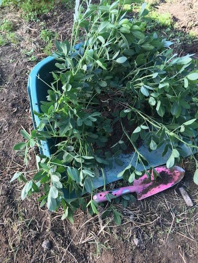 トマトのコンパニオンとして大活躍したはずの6株のラッカセイ。このトマト畝Ⅱにはキャベツを植えるので準備を開始。