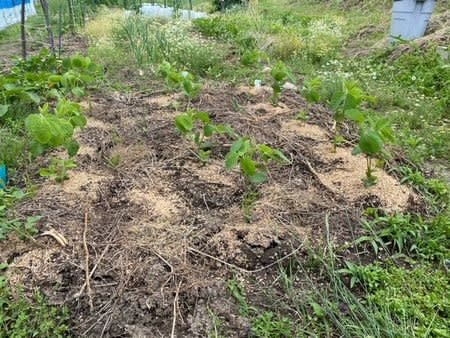 春夏野菜の定植は残りオクラとトウガラシだけになった。どちらも初登場で、トウガラシは自宅のサル撃退用として栽培している。