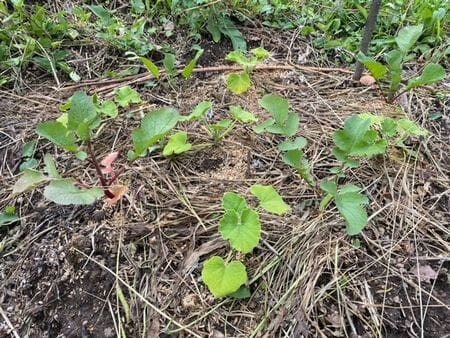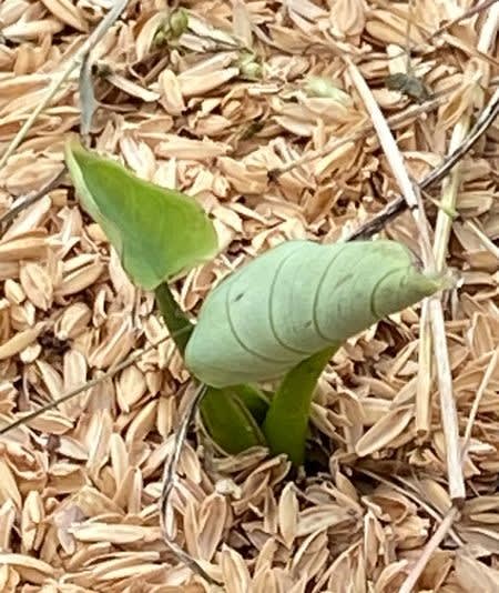 新登場メンバーのサトイモはもうだめかと思うほど遅い発芽。やっと顔見世するもまだ5センチほど。葉っぱが面白くて楽しみ。