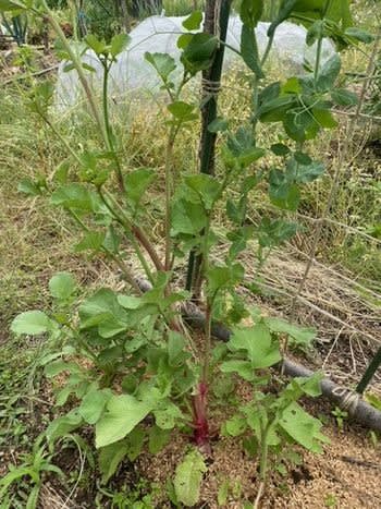 初登場はラディッシュも。グリンピースに混植したが、なぜか1本だけがピヨーンと背伸びして60㎝ある。茎も恐ろしいほど太くて硬い。