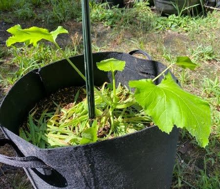 7月下旬に種を植えたズッキーニ。別名「つるなしカボチャ」といわれるように、分枝性が弱くて親づるだけが1.5~2m程度に伸長するためあまり場所をとらず、強健で栽培しやすい」「草葉立性」につられ、いつもの癖でまずは実践。