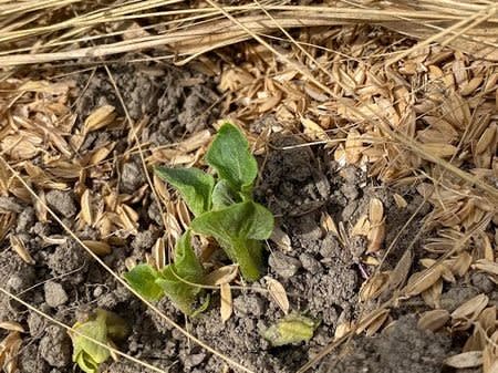 初挑戦のじゃがいも(キタアカリ)の二期作。芽を出した。成功すれば時間差による保管が可能になり、今回は4個分だけだが助かる。
