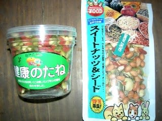 右:餌台に小鳥を呼びたくて、いけないなぁと思いながら買った「ナッツ&シード」は小動物・鳥用
