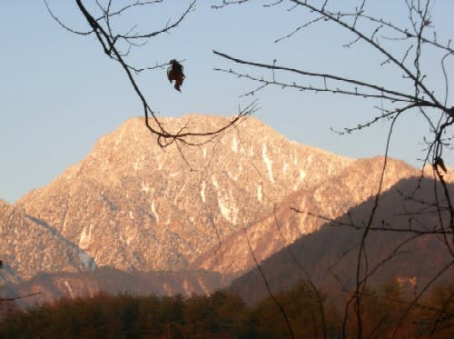 朝7時の外気温ー3℃。窓から見上げると有明山が朝日で焼けている