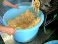 ○大豆を圧力鍋で蒸してつぶす。 ミンチ製作器みたいで豆がモンブランケーキの山のよう