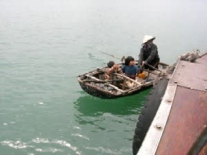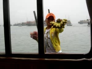 写真右:湾の船室で食事中ボートから這い上がってバナナを売る少年