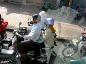 写真左:喧騒の町中ではオートバイが数珠繋ぎ、職場へ向かうカップルか?