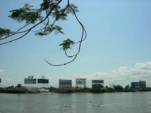 写真左:街にはサイゴン川が流れ、遠くに有名企業の看板がならぶ